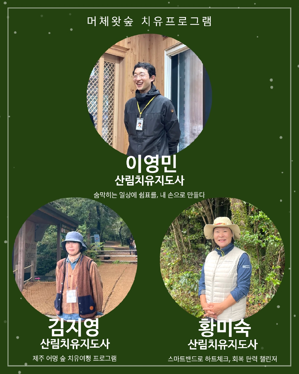 □ 이와 함께 머체왓숲에선 특별 산림치유 프로그램을 한정적으로 운영한다. △제주 어멍 숲 치유 여정 프로그램 △스마트밴드로 심박수 체크, 회복 탄력 챌린지 프로그램(바디리셋) △머체왓 숲에서 쉼표를, 내 손으로 만들다 등의 프로그램은 60% 할인이 적용된다.